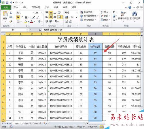 4、設置完成后,就可以看到數據表格按照“數學成績”進行重新排列了。