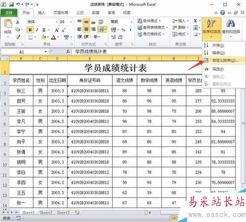 2、當然,Excel表格中也帶有自定義排序的功能,可以滿足用戶的很多要求。比如點擊“開始>排序和篩選>自定義排序”選項,如圖所示。