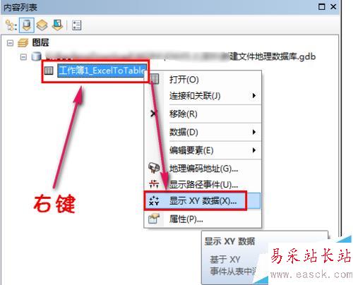 3、在內容列表中出現轉換好的表文件ExcelToTable(根據命名有所不同,此處是默認名稱),右鍵它選擇顯示XY數據。