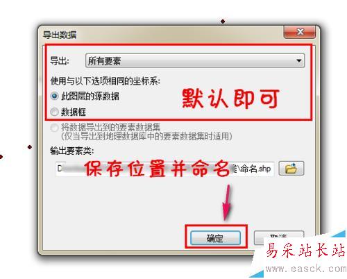 2、導出:一般默認導出所有要素,即導出Excel中所有數據;輸出要素類:選擇保存位置及命名文件,設置好后點擊確定