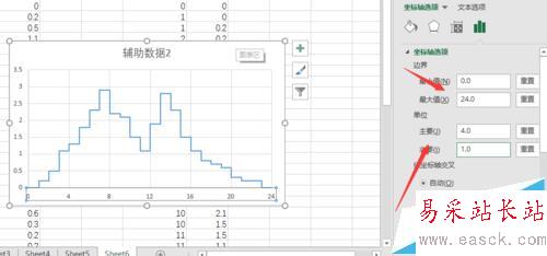 5、選中水平軸,雙擊打開設置坐標軸格式對話框,最小值設置為1,最大值為24固定值為1