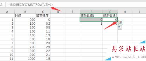 3、構造輔助數據2,并在G2中輸入“=INDIRECT("B"&INT(ROW()/2+1).然后復制填充至F49:G49