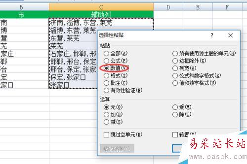 7、選擇山東的地市進行復制,然后使用選擇性粘貼,