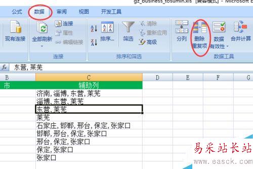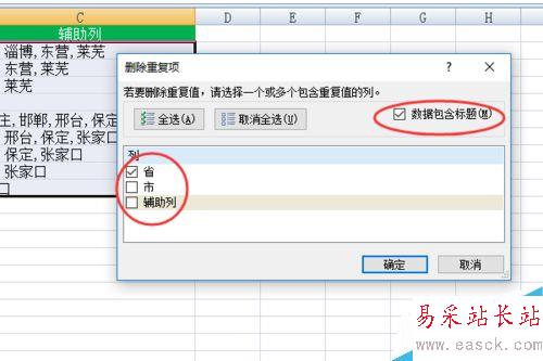5、刪除重復項窗口中去掉 市 和輔助列的勾選,并在右上角勾選上數據包含標題。