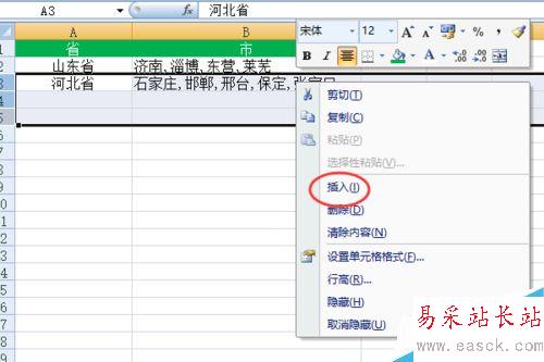 6、我們在山東省行下插入三行空行。選擇山東省下面三行后,右擊插入。