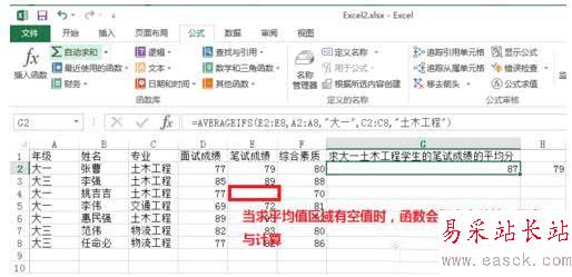 2、如圖所示,當求平均值區域有空值時,函數會把它去掉,不參與計算。有三個符合條件,但是有一個無成績,這時函數會把它去掉不參與計算。這是吧成績加起來求平均值,除以2還是除以3的問題,要注意。