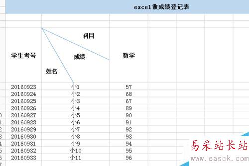 2、我們要做的是,將excel表顯示的更直觀好看些。成績、科目和姓名在一個格子里,如下圖的成品顯示。
