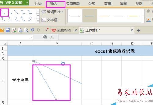 3、上面數據最難得就是成績和科目、姓名在一個格子里出現三個分隔。可以點擊“插入-圖形-直線”,根據你的需要進行直線的變換,如下圖的填充兩個格子。