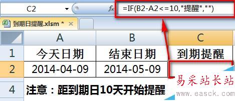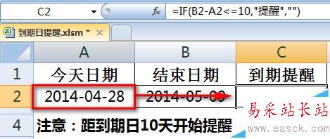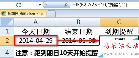 2、雙擊C2單元格,輸入函數:=IF(B2-A2<=10,"提醒",""),這時,如果B2的日期減去A2的日期(也就是今天的日期)小于等于10時,C2單元格會返回“提醒”二字,否則返回空白。