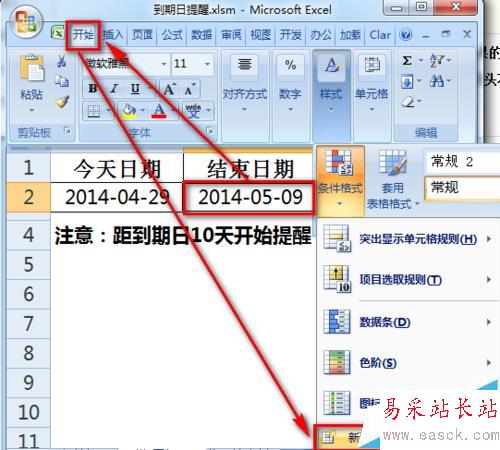 4、如果不想加C列顯示,只想在B列快到期時自動添加顏色顯示也可以用條件格式完成。、首先,選中B2單元格,選擇【開始】-【條件格式】-【新建規則】。