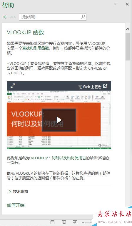 當然,Excel中起到查詢作用的不只有LOOKUP,還有其他多個函數,以及它們的組合使用(中括號中的參數可以省略)。這些函數的具體使用方法,可以參閱Excel的幫助文檔。在Excel 2016中,可以點擊上方的“告訴我想要做什么”,然后輸入想要了解的函數名,比如VLOOKUP,點擊獲取幫助,就可以得到想要的解釋,甚至還有相關的視頻教學教程呢。