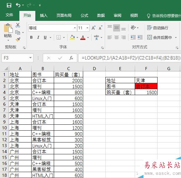 它的作用是,在F2單元格中輸入地址,在F4單元格中輸入數量,就可以查出該地區中售出的是哪一種圖書。這里的LOOKUP就是Excel的查詢函數之一。當然,你可以根據自己的需要,修改這個公式,以適應自己的需求。