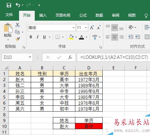 再比如有這么一個表格,記錄了公司員工的一些信息。本例中,在D10單元格中,依舊使用LOOKUP函數進行查詢,公式如下: