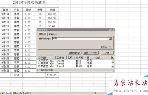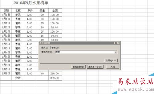 3、我們在查找的內容輸入需要插入空行的前一行B列單元格內容,如例題中,我們要求在蘋果的后面插入空行,我們就在查找的內容框里輸入蘋果。