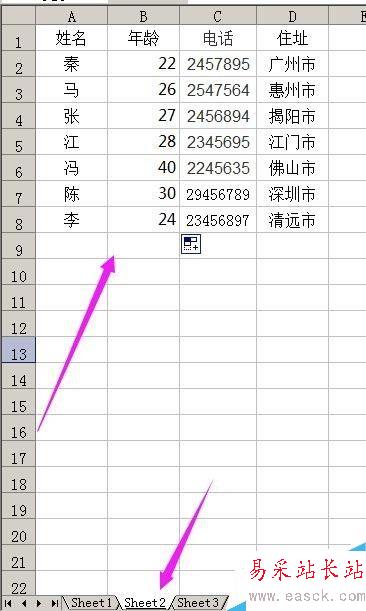 sheet1工作表有姓名和年齡的數據;sheet2工作表有姓名、電話和住址數據,但沒有年齡的數據;sheet1工作表的姓名和sheet2工作表的姓名一樣的,但順序是打亂的。