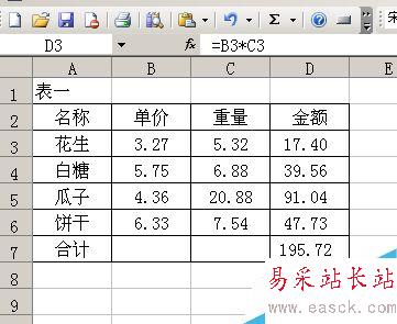 4、在D7單元格匯總所有的金額,結果顯示195.72。