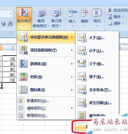 2、選中區(qū)域后(注意不要多選其他單元格),依次點(diǎn)擊“開始”-“條件格式”-“突出顯示單元格規(guī)則”-“等于”(最后的等于可根據(jù)實(shí)際需要選擇其他)。