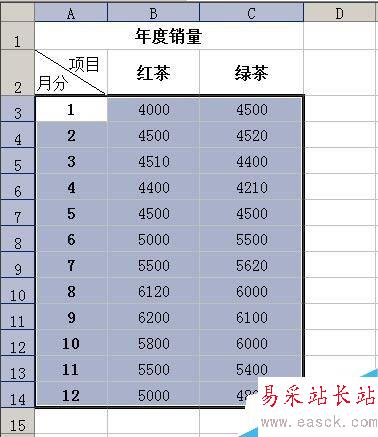 光標放在A3單元格,點住不放,拖移到C14單元格,如圖所示。