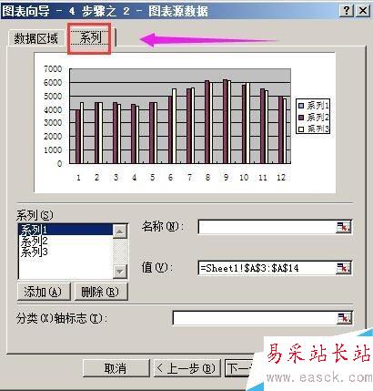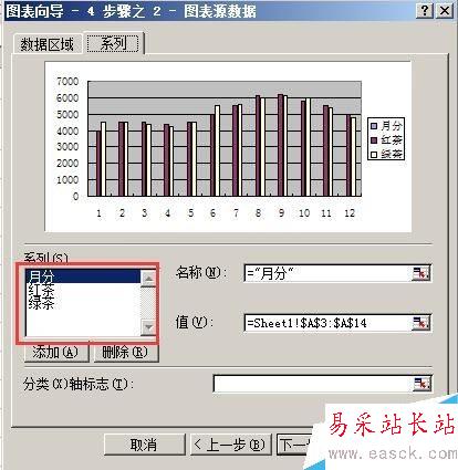 再在下方的圖中箭頭所指的位置,在”系列1“這里點下,在右側的編輯框內輸入”月份“;然后點第二個,系列2,在右側的編輯框內輸入”紅茶“;在第三個,系列3,在右側的編輯框內輸入”綠茶“,