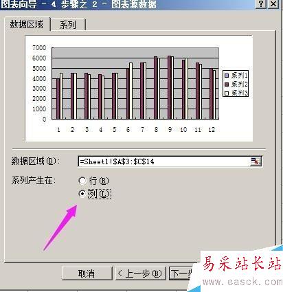 4、然后,點“下一步”;彈出設置框,在“數據產生在”,點選第二個的“列”