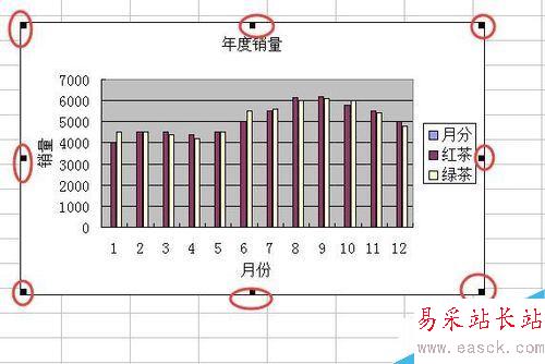 7、圖表是可以調節大小與插入位置的,在圖表中點下,圖表四周出來調節點,拖動調節點就可以調節圖表的大小,點住鼠標不放,可以移動圖表。