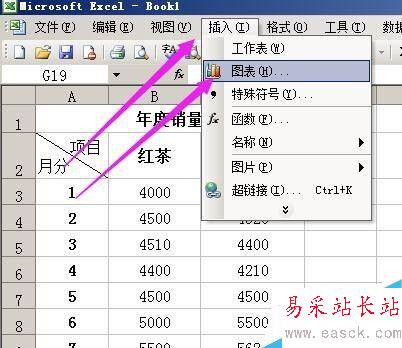 2、然后,在工作表上方的菜單欄中,點“插入”,彈出下拉菜單再點“圖表”。