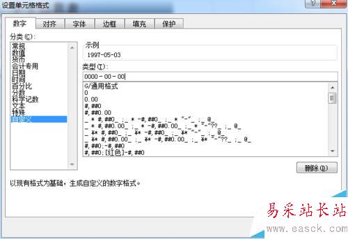 6、彈出“設置單元格格式”窗口后,依次點擊“數(shù)字”-〉“自定義”,在類型下輸入“0000-00-00”,如圖所示: