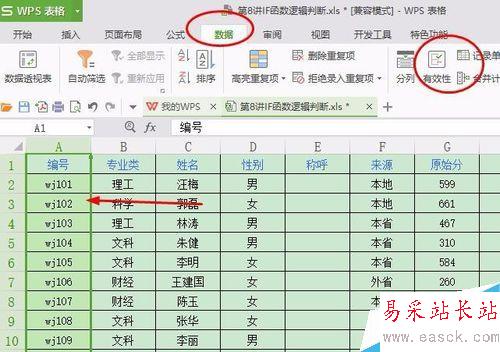 1、打開數據源,選擇需要限制重復輸入的行或者是列,也可以是區域。