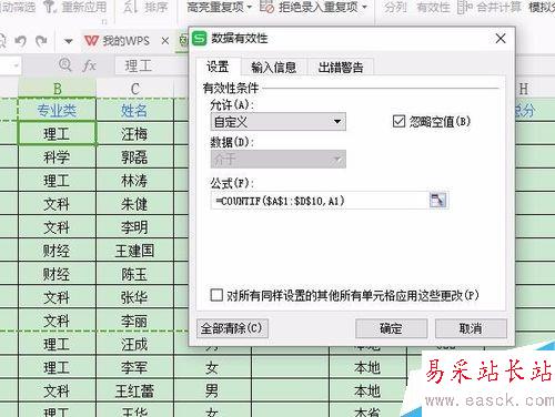 5、在“公式”區域中輸入 =countif($A$1:$D$10,A1) ,就可以限制A1—D10區域不重復。A1 和D10數據都是可以根據實際情況更改的。A1是起始區域,D10是終結區。