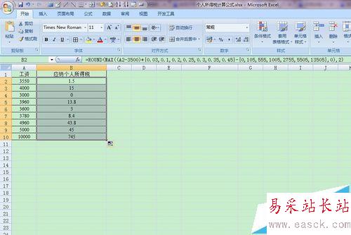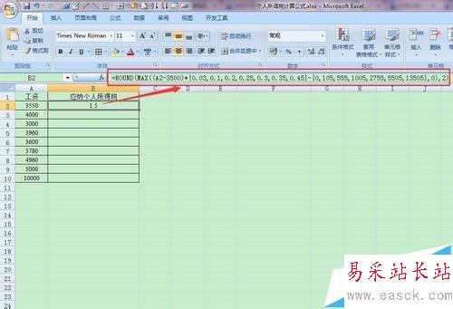 3、在工作表B2輸入公式:=ROUND(MAX((A2-3500)*{0.03,0.1,0.2,0.25,0.3,0.35,0.45}-{0,105,555,1005,2755,5505,13505},0),2)