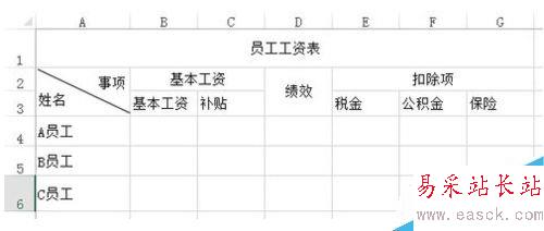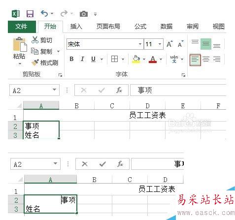 2、選中2、3兩第A列的兩個(gè)單元格,點(diǎn)擊工具欄上的【合并后居中】。 輸入文字“事項(xiàng)”按鍵盤上的ALT+Enter鍵換行,輸入“姓名”。