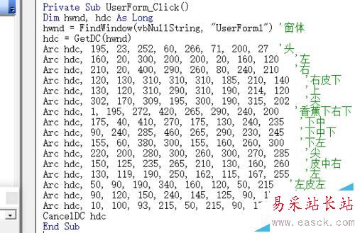 5、雙擊窗體,就像模塊編程一樣,來做窗體編程。實際上是編寫一個窗體單擊事件的響應程序,當鼠標單擊窗體時,就完成這些動作。哪些動作呢?找窗體——找畫布——畫圖——釋放畫布。畫圖就是畫16個圓,當然大多數是橢圓。也就是說,這只“香蕉”是由這16個圓組合出來的圖形!怎么樣?神奇吧!