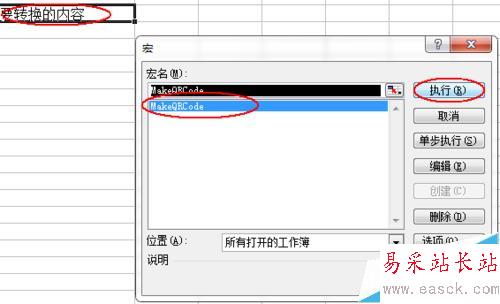 7、使用方法:選中要轉(zhuǎn)換二維碼的單元格,按alt+F8快捷鍵調(diào)出執(zhí)行窗口,選中MakeQRCode 執(zhí)行
