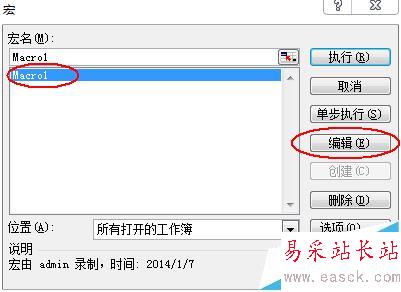 4、按alt+F8 進(jìn)入執(zhí)行對話框,選中剛才錄制的宏,單擊編輯進(jìn)入VBE編輯器