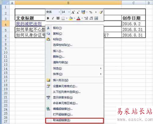 4、取消超鏈接:鼠標右鍵單擊需要取消超鏈接的單元格,出現(xiàn)下圖所示列表,單擊途中所標注的“取消超級鏈接”就OK了,文本會自動換成黑色。
