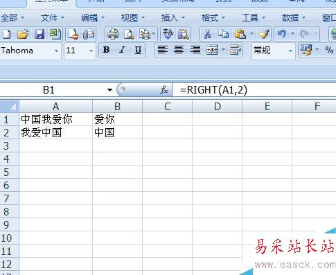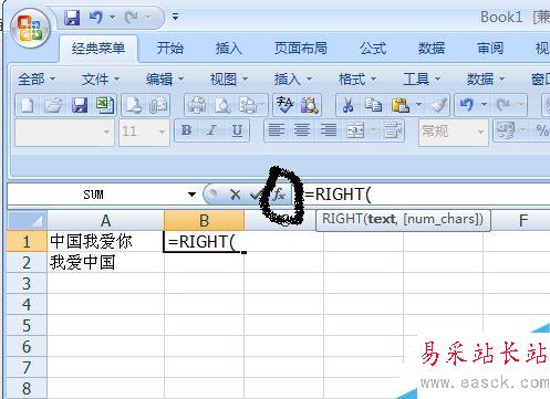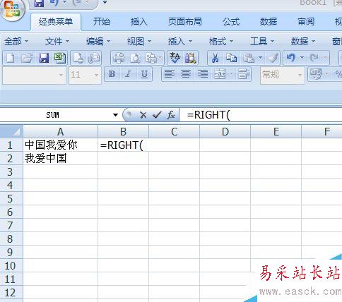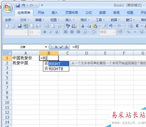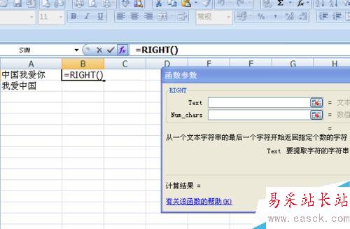 3、我們在B1單元格中輸入=Right,會彈出如圖效果