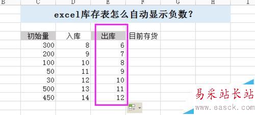 2、在這個(gè)表單里,我們看到,在“出庫”這一欄目,我們輸入的數(shù)字是正數(shù),我們需要讓他默認(rèn)顯示成負(fù)數(shù)。