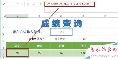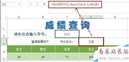 總分:=VLOOKUP(C2,Sheet2!A:G,6,FALSE)