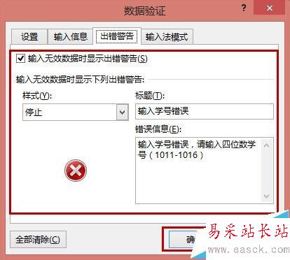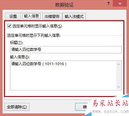 5、再分別在“輸入信息”和“出錯警告”選項卡,輸入相關信息如下圖所示。輸入完成后點擊“確定”即可。