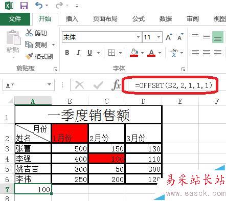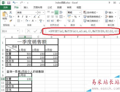 3、如圖所示,offset在實際運用中用于查詢,offset函數是查找函數。查詢一季度3月份個人的銷售額??梢酝ㄟ^,以A2為參照系,向下1,向右3,可以得到銷售額。使用match函數來確定行列偏移量。