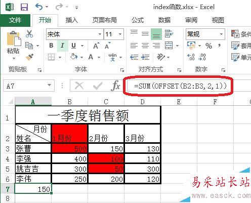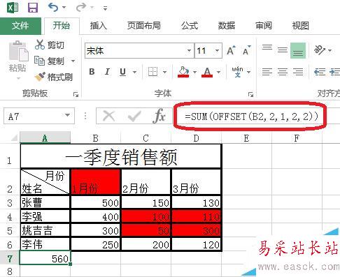 可以看出向下2,向右1,返回2行2列,返回的是區域,返回的是數組{100,110,50,300},。最后使用sum進行求和。