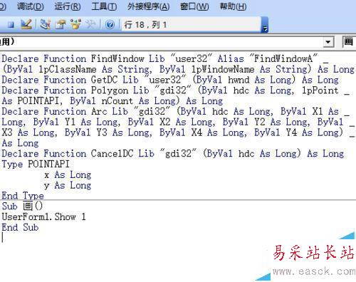 3、模塊編程。在模塊1內編程,聲明5個函數、1個結構,并編寫一句顯示窗體的程序——“畫”。