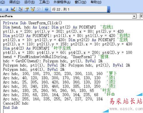 5、窗體編程。雙擊窗體進入編程界面,編寫窗體單擊事件觸發的程序,調用模塊1里聲明的5個函數、1個結構編寫程序。重點畫好7個圓、4條線。