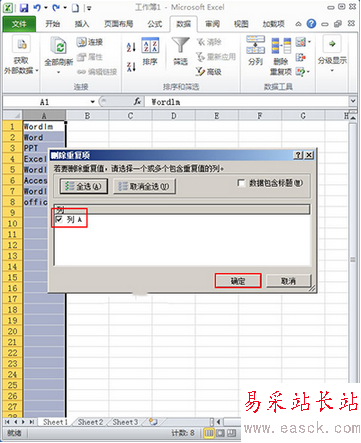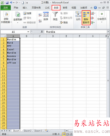 1、以下面的表格為例,選中A列,切換到【數(shù)據(jù)】選項(xiàng)卡,單擊【數(shù)據(jù)工具】選項(xiàng)組中的【刪除重復(fù)項(xiàng)】。
