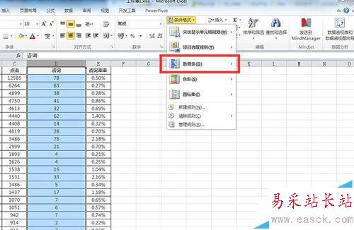 2、點擊“條件格式”,彈出一個下拉選項框,找到“數據條”選項。
