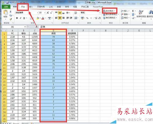 1、打開Excel工作表選中需要加工作條的單元格,點擊“開始”菜單,在開始菜單下面的工具欄中找到條件格式選項。