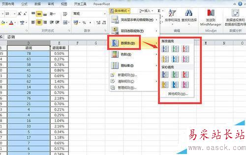 3、鼠標直接放在“條件格式”選項上會出現下一級選項框,選擇“數據條”,對格式條進行設置。