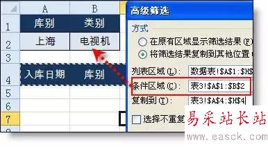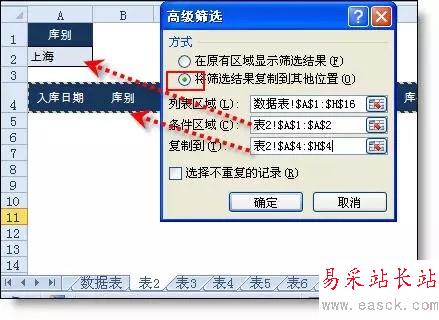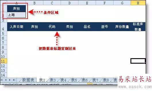 設置條件區域:在表2設置條件區域,第一行為標題“庫別”,第二行輸入“上海”,并把標題行復制到表2中任一行。