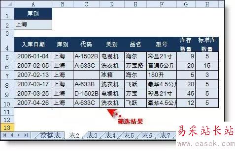 條件1:篩選“庫別”為“上海”的行到表2中。
