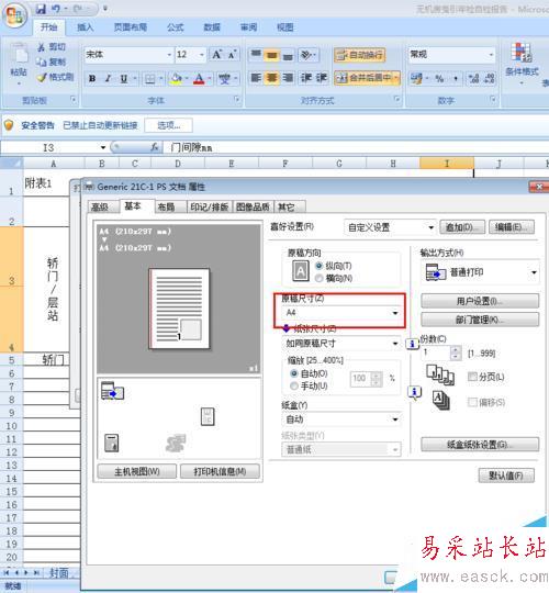 3、點擊屬性,出現(xiàn)文檔屬性頁面,在基本中,原稿尺寸一般默認為A4紙.